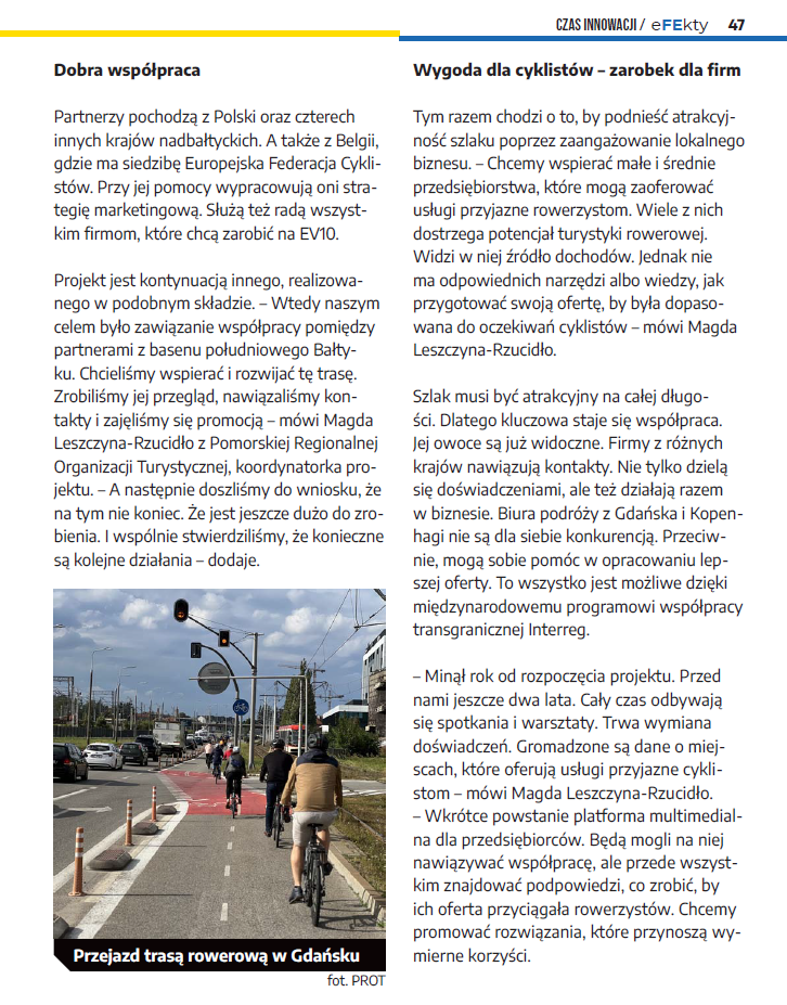 Bałtycki Szlak Rowerowy to nie tylko trasa pełna pięknych widoków – to także przestrzeń, w której zyskują nie tylko rowerzyści, ale również lokalne firmy. W najnowszym numerze biuletynu eFEkty opisujemy, jak projekt Baltic Biking Upgrade pomaga przekształcać tę trasę w miejsce jeszcze bardziej przyjazne zarówno dla turystów, jak i przedsiębiorców.